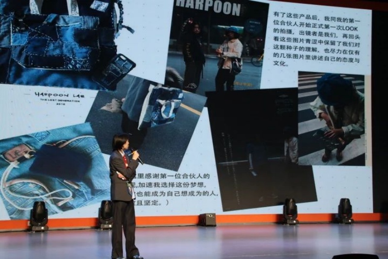 大屏幕上,一张2016年的课堂旧照定格青春:靛蓝染制的方巾、解构重组的VANS鞋、刺子绣手机壳堆满教室,这是苏畅与同学通宵创作的“不务正业”之作,却意外成为淘宝爆款,孕育出首个品牌“HARPOON LAB”。